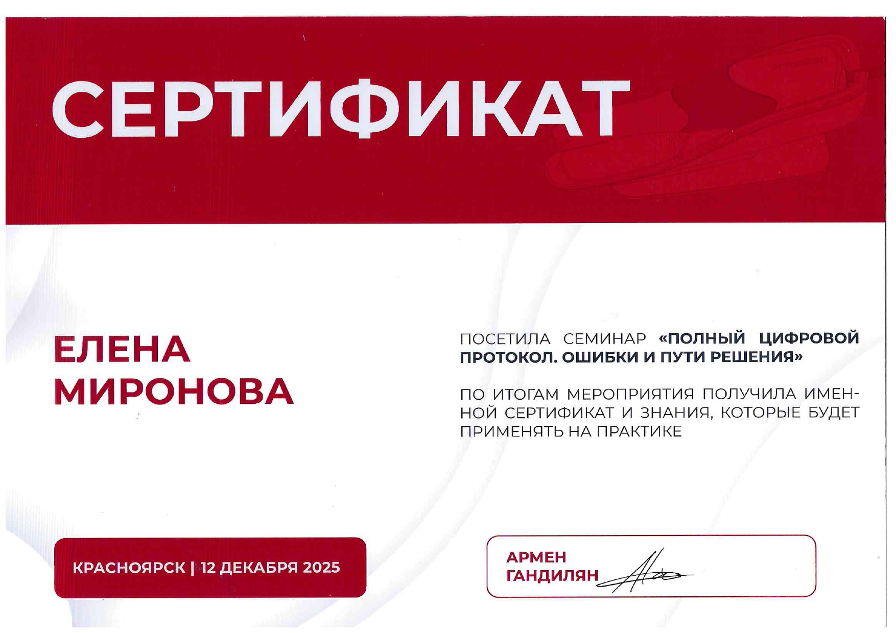 Интернатура, Красноярский государственный медицинский университет имени профессора В. Ф. Войно-Ясенецкого, 2012г., стоматология общей практики, врач-стоматолог общей практики.